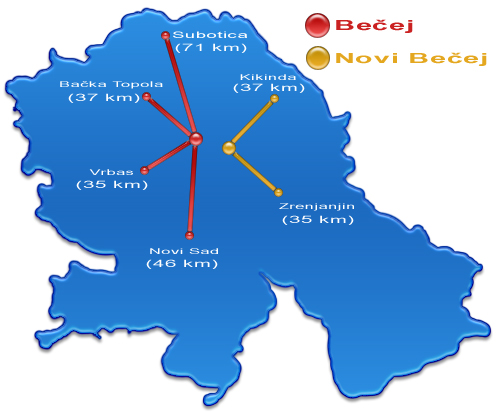 Udaljenost opština Bečej i Novi Bečej od drugih većih gradova i opština: